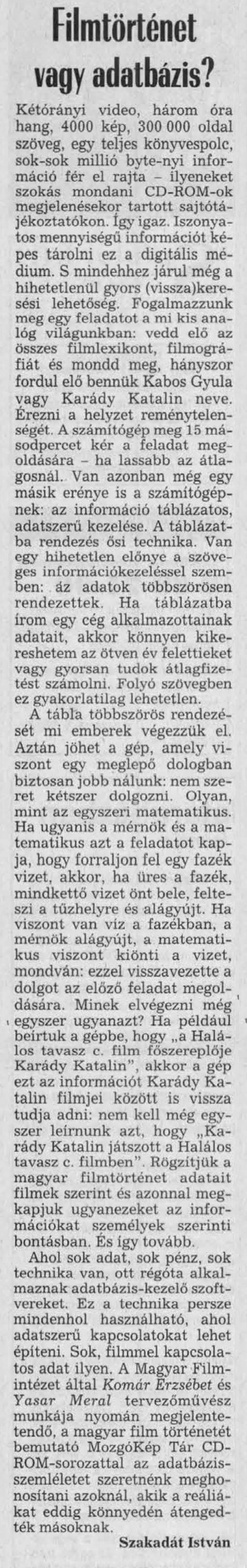 Amikor 1989-ben a Segédkönyvet leadtuk a nyomdába, a négyéves munka lezárásaként azt mondtam: "adatbázisban kellett volna megcsinálni az egészet". A könyv műfaja, egész szerkezete ezt kívánta volna meg. Papíron ez nem volt lehetséges. 1991-ben kezdtük el a választási, társadalomstatisztikai adatokat gyűjteni, amelyek természetesen már eleve strukturált adatokként álltak rendelkezésre. Akkor már tudtuk, mi az adatbázis-formátum előnye. Amikor 1993-ban a Segédkönyv adatai alapján megcsináltuk a Politika CD-t, lehetett volna adatbázisból dolgozni, de akkor még nem tudtuk ezt CD-n megvalósítani. Az 1996-ban megjelent első MozgóKépTár lemez már adatbázis-alapra épült, és így maradt ez a többi MKT-lemez esetében is. Onnantól kezdve csak adatbázisokkal foglalkoztam. Próbáltam megérteni, miért (1, 2, 3).